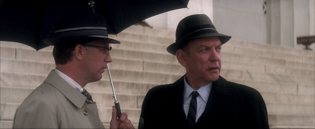 Michael Rooker, Laurie Metcalf, and Jay O. Sanders highlight Garrison’s team of assistants and understudies, Sissy Spacek plays the idealistic and determined lawyer’s wife, who supports initially her husband’s quest for justice, but succumbs to fear and exhaustion– both of public opinion and other elements far more insidious – when Garrison’s case gains international attention, and Joe Pesci and Kevin Bacon play brash and fiery parts as cogs to Clay Shaw’s own apparent conspiracies.  Most notably, in a small – I can in no way refer to it as minor – but incredibly memorable role, Donald Sutherland portrays Garrison’s important and enigmatic nameless source, X, who meets the district attorney in Washington, D.C., under the Parthenon-like shadow of the Lincoln Memorial, and effectively pulls the seat out from under him with a vivid and unsettling fifteen-minute monologue that attacks every belief and trust he once had in the government he had served during a sequence of cinematic spellbinding for the ages.
